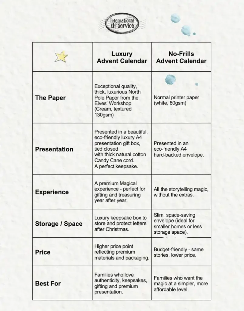 At International Elf Service, we’ve created two versions of our much-loved Magical Advent Calendar of Elf Letters, so families can pick the one that suits them best. Both include 25 daily Elf letters packed with North Pole adventures (plus one from Father Christmas or Santa!) but they differ in how they’re presented.